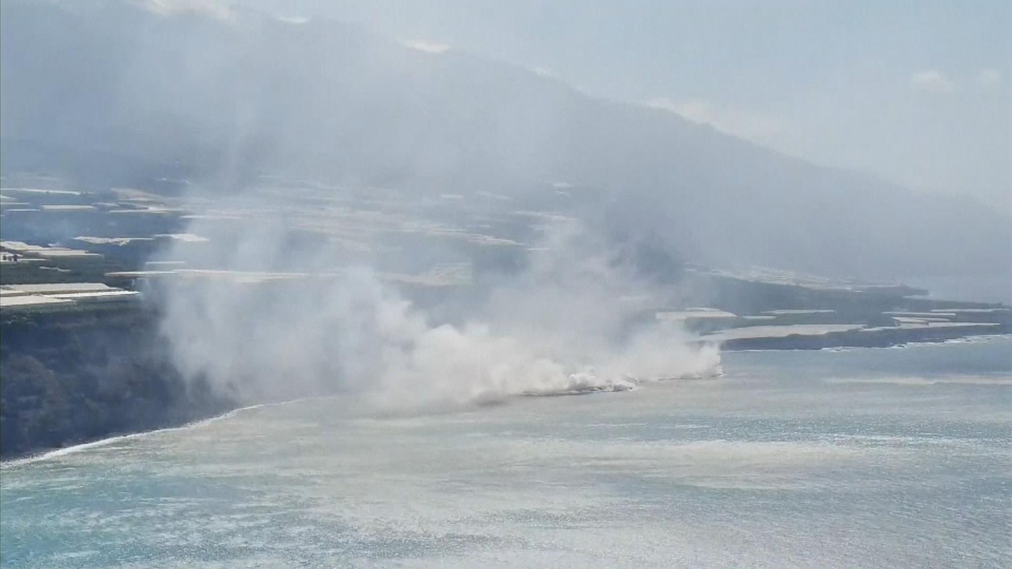 Unstoppable rivers of lava spew from crater - destroying everything in their path. Lava from an erupting volcano on Spains La Palma island has reached the Atlantic Ocean raising fears of toxic gases being released and explosions. La Palma volcano eruption.